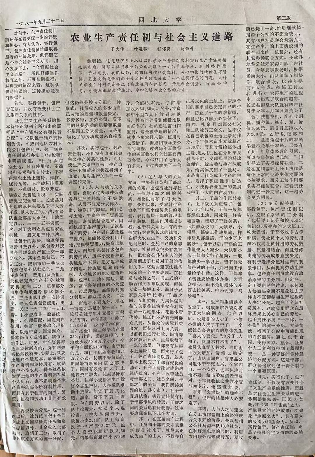 1979年4月26日,郭校长参加了政治经济学专业学生的理论讨论会,他在讲话中对举办学生理论讨论会表示热烈支持并指出:我们在思想上要做到四个坚持,在学术上则要提倡百花齐放、百家争鸣。他鼓励同学们努力研究我国经济建设的实际问题,希望拿出有说服力或者建设性的学习、研究成果。他还对同学们的学习、讨论方法提出了一些建议,使大家深受启发。正是在郭校长的亲切鼓励和大力倡导下,经济系七八级学生丁文锋、叶道猛、程怀岗、马恒升等,大三时利用暑假到农村搞经济调查,向社会学习,并结合专业课教学,写出了一份题为《振兴农业的必由之路——陕西农村农业生产责任制调查》的高质量调研报告,后荣获陕西省社会科学研究成果一等奖。