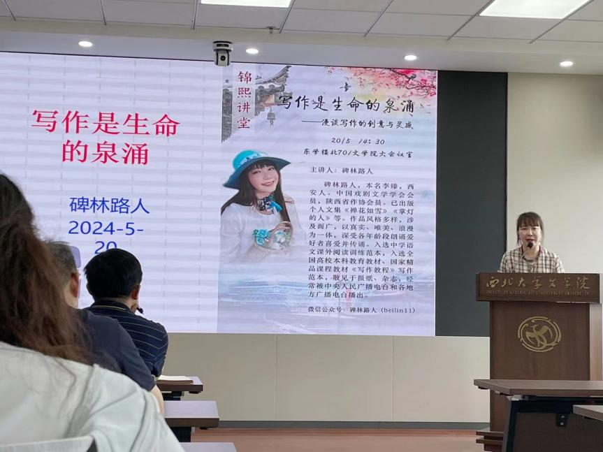 2024年5月20日下午,中国戏剧文学学会会员、陕西省作协会员碑林路人老师应邀在必赢76net线路官网举行《写作是生命的泉涌——漫谈写作的创意与灵感》讲座。讲座由必赢76net线路官网副院长杨遇青教授主持,创意写作教研室主任关峰副教授、苏岑博士等及创意写作专业全体硕士研究生共同出席本次活动。